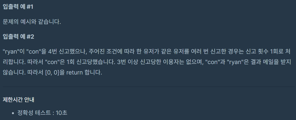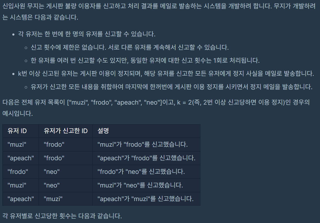 문제 설명 신입사원 무지는 게시판 불량 이용자를 신고하고 처리 결과를 메일로 발송하는 시스템을 개발하려 합니다. 무지가 개발하려는 시스템은 다음과 같습니다. 각 유저는 한 번에 한 명의