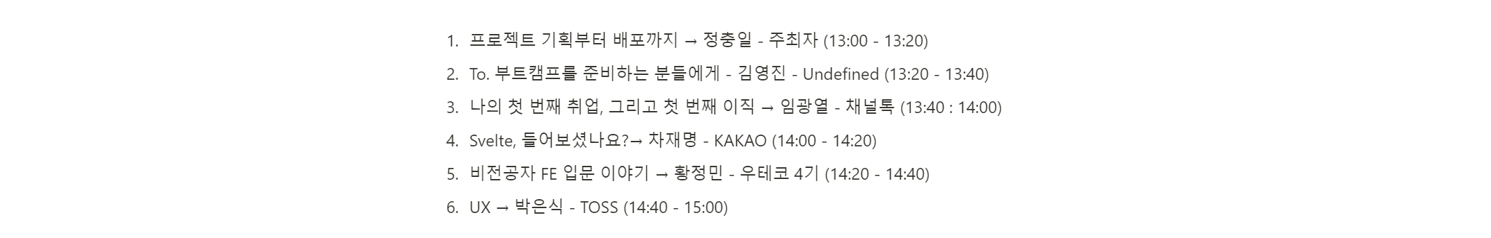 원래는 위에서 계속하여 언급이 되었지만 초반에는 발표가 기술에 초점이 맞추어져 있었어요. 누구는 webpack에 대해서, 누구는 vite에 대해, react에 대해, typescript에 대해서 등 기술 발표를 하려고 하였습니다. 애초에 스터디에서 출발했기 때문인데요. 진행하면서 컨퍼런스로 바뀌었고 자연스럽게 대상도 바뀌었었습니다. 그런데 내용은 그대로였어요.