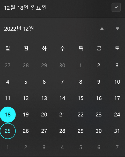 | 일 | 월 | 화 | 수 | 목 | 금 | 토 |