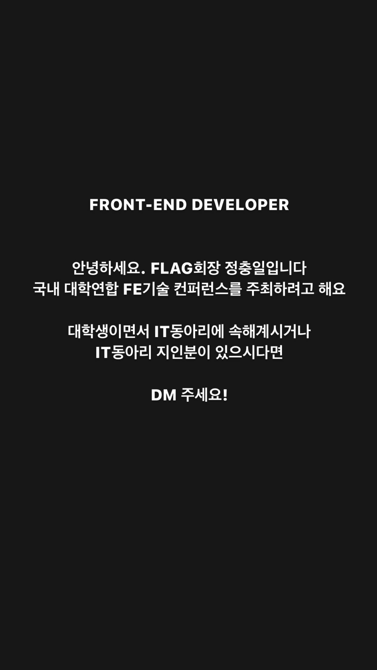 교내에서 Frontend 관련 스터디를 하고 싶었어요. 그리고 사람을 모집해봤지만 지원자를 한 명도 구할 수가 없었습니다. 제가 만든 교내 IT 동아리 인원만 해도 155명이 있었는데도 말이죠. 그래도 저는 여기서 포기할 수 없었어요. 함께 공부할 수 있는 스터디가 필요했거든요. 그리고 이번에는 대학생분들과 함께 하고 싶었어요. 교내에서는 구하지 못하여 다른 대학교에서 프론트엔드로 진로를 정하고 공부하신 분들에게 연락을 했습니다.