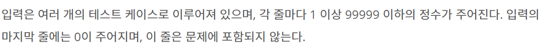 입력은 여러 개의 테스트 케이스로 이루어져 있으며, 각 줄마다 1 이상 99999 이하의 정수가 주어진다. 입력의 마지막 줄에는 0이 주어지며, 이 줄은 문제에 포함되지 않는다.