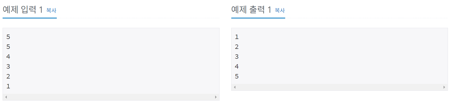 www.acmicpc.net/problem/10989 10989번: 수 정렬하기 3 첫째 줄에 수의 개수 N(1 ≤ N ≤ 10,000,000)이 주어진다. 둘째 줄부터 N개의 줄에는 숫자가 주어진다. 이 수는 10,000보다 작거나 같은 자연수이다. ww..