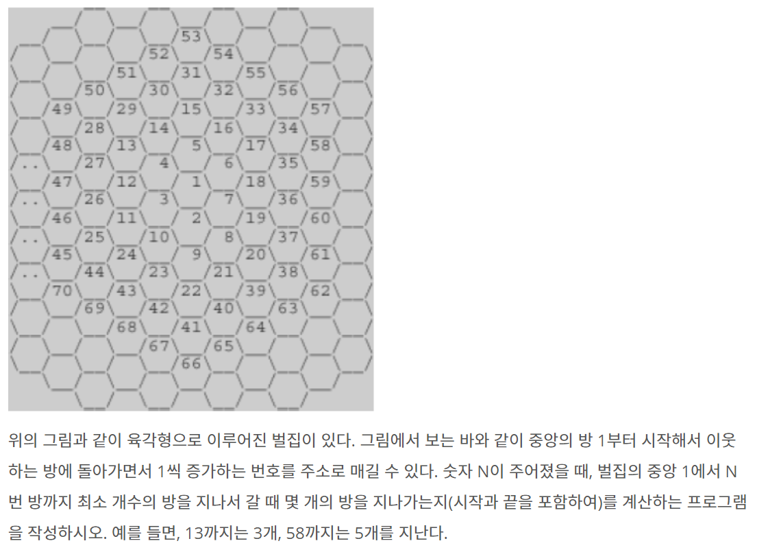 위의 그림과 같이 육각형으로 이루어진 벌집이 있다. 그림에서 보는 바와 같이 중앙의 방 1부터 시작해서 이웃하는 방에 돌아가면서 1씩 증가하는 번호를 주소로 매길 수 있다. 숫자 N이 주어졌